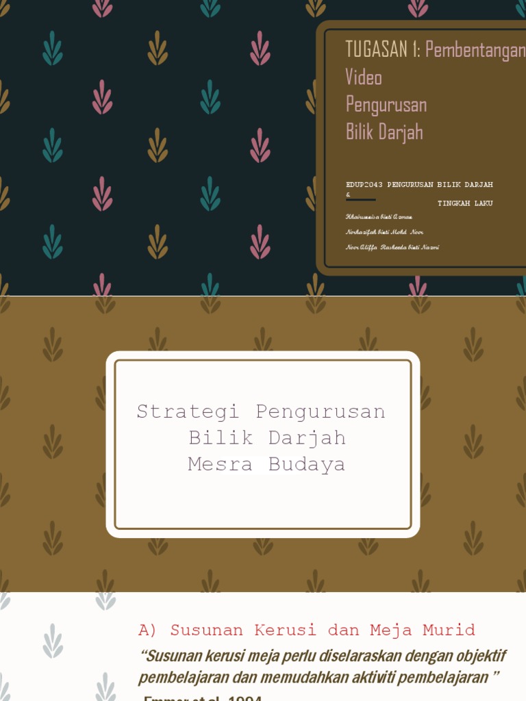 MOHAMAD KHAIRI NAIM BIN HUSIN D20141066450 MOHD SYAMIL BIN SHAFIEE D20141066452 MUHAMMAD AMMAR BIN MAD NAZIR D20141067460 NURASMIDA BT AZMI D21041066446 SITI MARDHIYYAH BT MOHD RAMLI D20141066445 SHERIN AZLIN BT MD YOB D20141066421. Setiap aktiviti pengajaran akan berlaku dengan lancar sekiranya bilik darjah mempunyai aktiviti pembelajaran yang tidak ada gangguan tingkah laku yang tidak menyenangkan.
